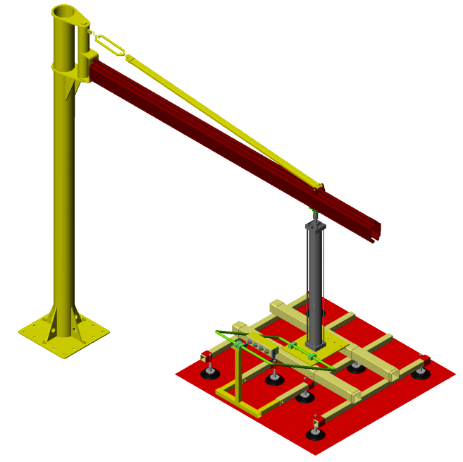 吊具为吊钩式,可接夹具。动作过程:根据工件的位置调整吊钩勾取工件,后通过旋转关节和提升气缸将工件移动到指定位置后放下工件,循环下一个工作流程。